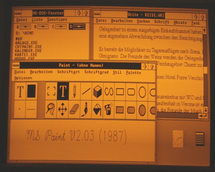 | Beispiel für Anwendungssoftware: Windows 2.03 mit seinen Fenstern im Multitaskingbetrieb. | ![]() |