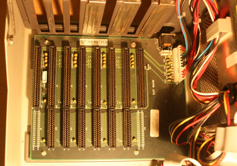 | Der Rechner hat noch eine Besonderheit: entgegen dem späteren Trend, generell eine Hauptplatine mit Bus-Steckplätzen für die Erweiterungskarten zu bauen, wird hier ein konsequenterer Weg der Bus-Architektur begangen: Alle Komponenten, auch die Prozessorplatine, sind als Steckkarten ausgeführt. Heute findet sich so eine Architektur nur noch in der Industrie. Damals war es wohl manchmal ganz praktisch, um die Komponenten besser in das Gehäuse zu bekommen, ein 286-er Motherboard hatte damals eben noch nicht ITX-Masse... |